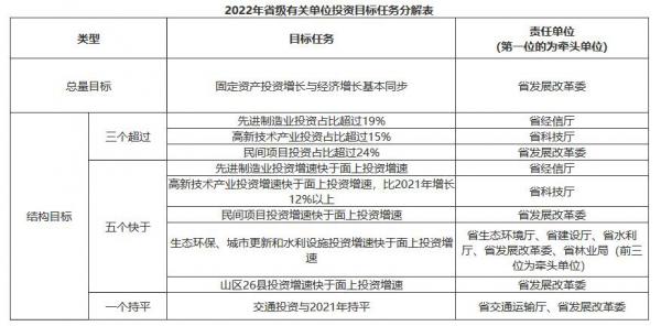 2.優(yōu)化投資結(jié)構(gòu)。力爭(zhēng)2022年先進(jìn)制造業(yè)投資、高新技術(shù)產(chǎn)業(yè)投資和民間項(xiàng)目投資,占全省投資比重分別超過(guò)19%、15%和24%;先進(jìn)制造業(yè)投資,高新技術(shù)產(chǎn)業(yè)投資,民間項(xiàng)目投資,生態(tài)環(huán)保、城市更新和水利設(shè)施投資,山區(qū)26縣投資增速快于面上投資增速;交通投資與2021年持平。
