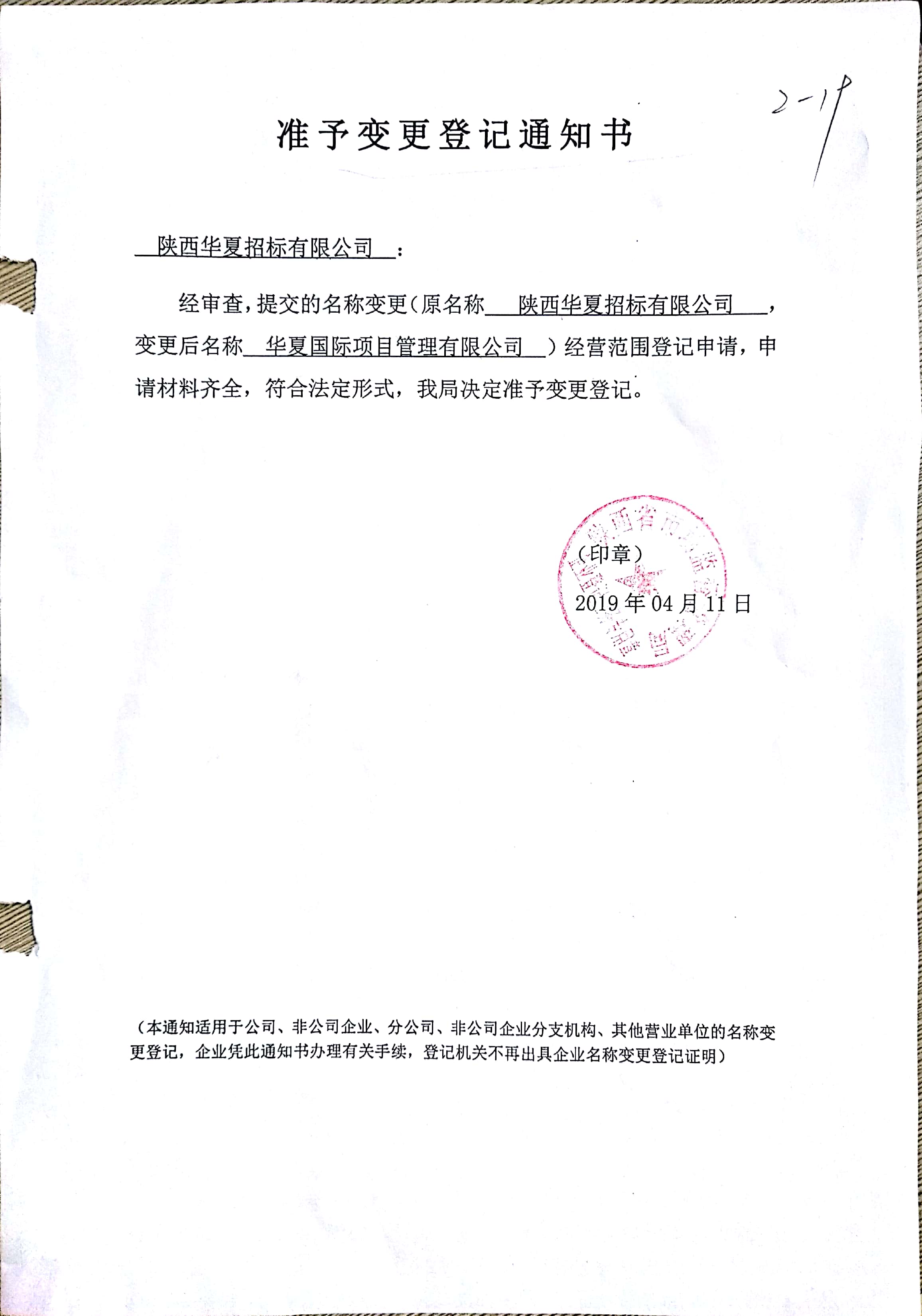 華夏國際項目管理有限公司系原陜西華夏招標有限公司,已于2019年4月1日正式經(jīng)國家市場監(jiān)督管理總局核準,依法將企業(yè)名稱變更(詳見(國)名稱變核內(nèi)字【2019】第14109號通知書);2019年4月11日,完成公司名稱的變更(詳見陜西省市場監(jiān)督管理局出具的準予變更登記通知書)。