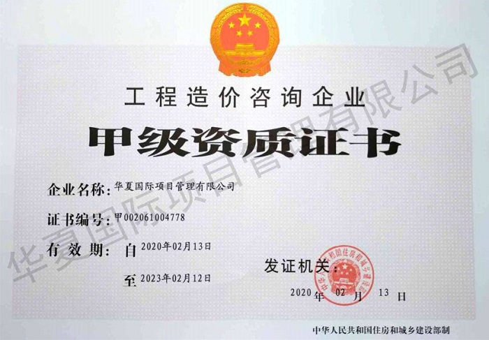 華夏國際項目管理有限公司于2020年2月13日正式取得中華人民共和國住房和城鄉建設部頒發的工程造價咨詢企業甲級資質證書,標志著我司在工程造價咨詢行業的發展邁上了一個新的臺階。