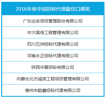 廣東達安項目管理股份有限公司中大國信工程管理有限公司四川五洲招標代理有限公司河南永正招標代理有限公司陜西華夏招標有限公司內蒙古北方誠信工程項目管理有限公司惠州市懿鑫招標代理有限公司鏈接:http://www.paihang360.com/zt/jujiao2017/bd/index.html