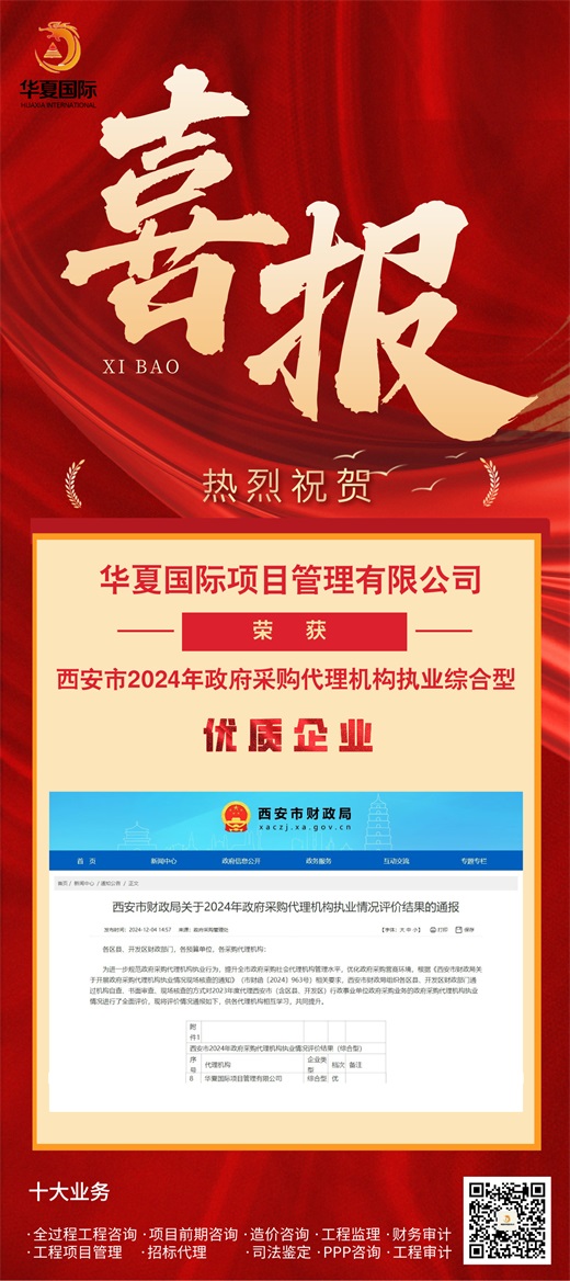 華夏國際項目管理有限公司獲評西安市2024年政府采購代理機構執業綜合型優質企業
